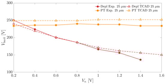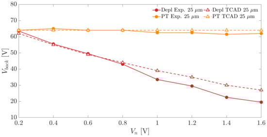 Figure 15 and Figure 16 show the depletion and punch-through voltages, experimental and simulated, for the two substrate thicknesses as a function of the applied . The results show in both cases a negligible effect of the applied frontside voltage on the punch-through onset. On the contrary, the full depletion voltages decrease significantly by increasing the applied . This determines an increase in the operating voltage range that can be exploited to bias the sensors by simply increasing . Since, for a safe sensor operation, a sufficient margin between depletion and punch-through voltage needs to be available, the sensors can operate properly when the applied frontside nwell bias is higher than 0.4 V.