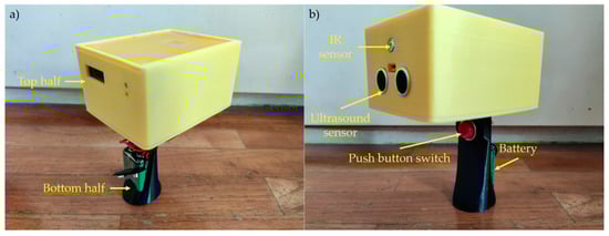 (a) Back view of prototype segmented into the top (yellow) and bottom (black) half with color differentiation for display purposes. (b) Front view of prototype displaying the IR sensor and ultrasound sensor in the top half. The bottom half of the device includes the push button switch and battery holder.