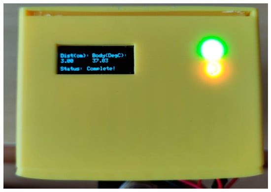The Arduino IDE 1.8.13 software is used to program the thermometer. Holding down the push button activates the measurement within 2–4 cm (the range recommended by sensor manufacturers) from the volunteers’ forehead. Five readings from the ambient and surface body temperature would be made and the average shown. Simultaneously, the ultrasonic sensor detects the distance from the target area and calculates the average of five readings. With the inputs of distance and temperature to the algorithm, the compensated reading from the algorithm would be displayed on the mono color, 128 × 64 pixels OLED module (Figure 3).