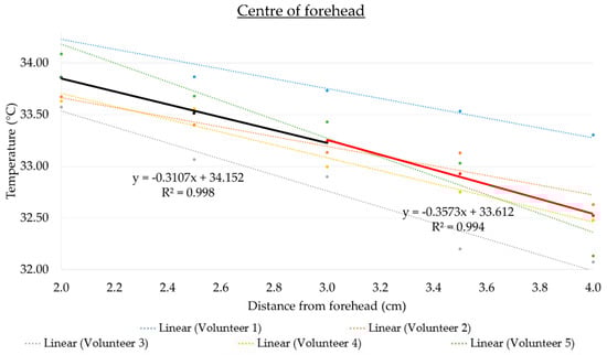 Linear regression models were applied on the measured readings for each volunteer. The compensation adjustments lines for the temperature (y) against the distance (x) over two different ranges (2–3 and 3–4 cm, respectively) were obtained, as shown in Figure 5. The data points between 2–3 cm are used to generate a best-fit straight-line equation y = −0.3107x + 34.152, with a coefficient of determination R2 = 0.998. Similarly, a best-fit straight-line equation of y = −0.3573x + 33.612 is obtained using the measured readings from 3–4 cm, with R2 = 0.994. With the R2 close to 1 in both linear regression models, the sensor used in this experiment is shown to have high reproducibility for measuring the temperature (based on the IR temperature sensor) and distance.