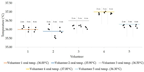 Based on the ANOVA results, there was no statistically significant difference in the temperature measurement from the center or lateral area of the forehead against the oral temperature (Figure S1). However, Dunnett’s post-hoc test showed that the p-value differences between the measurements from the center of the forehead to the control was higher than that of the measurement of lateral areas to the control across all volunteers. Between 2–4 cm, the measured temperatures were within a range of ±0.29°C of their oral temperature (Figure 6). Despite the presence of outliers, the recorded temperature displayed a standard deviation of ±0.3 °C (Volunteer 3) from the oral temperature.