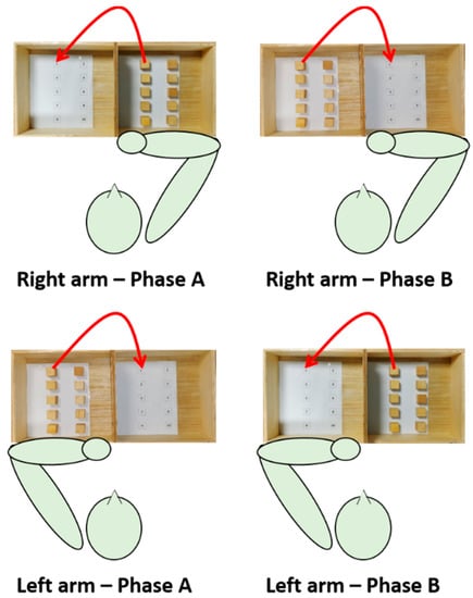 The motor task was a modified version of the BBT (namely targeted BBT) and consisted of transporting each block over the partition starting with the innermost left block (n° 1), and moving across the rows following the numbering, and placing it in the corresponding position as accurately as possible. Each IMU-based targeted BBT task was composed of two phases, phase A (ipsilateral subtask) and phase B (contralateral subtask). Each task was executed twice with each arm; since the first execution allowed the subject to become familiarized with the experiments, data analysis was conducted on the second execution only.
