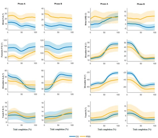 The mean joint angles registered significant differences between the PDG and the CG in the following angles: wrist F-E (both arms, both phases) and URD (both arms, both phases); forearm P-S (both arms, both phases); shoulder F-E (non-dominant arm, both phases) and R (both arms, both phases); trunk F-E (non-dominant arm, both phases) and R (both arms, both phases).