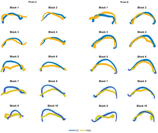 Averaged hand trajectories for both CG and PDG for each block of phase A and B (dominant side). Trajectories are obtained from the projection of 3D curves in the 2D coronal plane. The thickness of lines represents the dispersion of data around the mean trajectory.