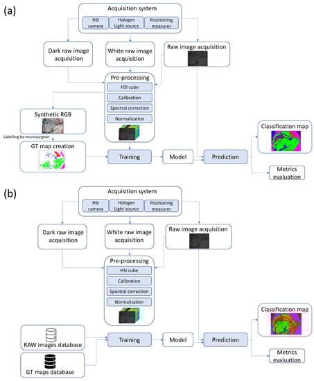 This section details the materials and methods used to acquire and process hyperspectral images from the database of brain tissue captures obtained during surgery. In addition, this section describes the classification ML techniques developed, the model selection and the metrics used to evaluate the classifiers’ performance.