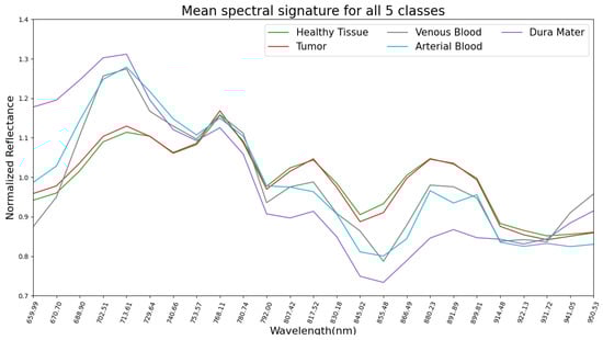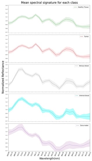 The mean pre-processed (explained in Section 2.4) spectral signatures per pixel of each class from the 13 hyperspectral images used in this study are represented in Figure 2. Here, it can be observed that healthy tissue and tumor classes are very similar across the 660 to 950 nm spectrum. This might explain why SVM, RF and CNN had difficulties in classifying tumors during the experiments for this work, later discussed in Section 3. Regarding the venous blood and arterial blood classes, they both have similar spectral signatures, although they have different tendencies from the healthy tissue and tumor classes. Dura mater’s mean spectral signature is the most distinct one in Figure 2, which might explain the high accuracy prediction over this class with the SVM, RF and CNN trained models. For further analysis, individual mean spectral signatures for each class with their corresponding standard deviations are represented in Figure 3, where both healthy tissue and tumor classes have low standard deviations. Moreover, these two classes have a high number of labeled pixels, as shown in Table 1, with more than 28,000 pixels for healthy tissue and more than 15,000 pixels for tumors. This might indicate that these classes are very consistent across the 660 to 950 nm measured spectrum in this work for all 13 images.