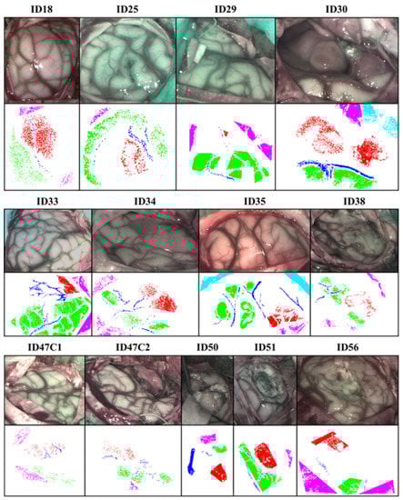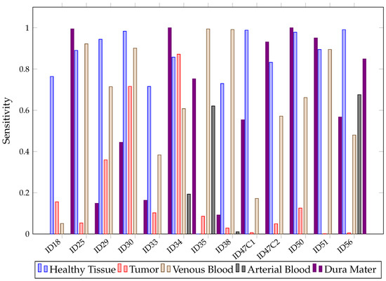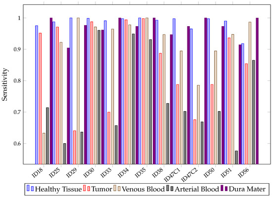 It should be noted that the sensitivity of arterial blood with SVM is very weak, with an average of approximately 8%. This may be due to the fact that the arterial class has very few labeled pixels, as shown in Table 1. This table shows that the maximum percentage of labeled pixels of artery over the total image is 12.46% in patient ID47C2, but in 8 of the 13 patients, it is less than 2%. During the surgery, it is not crucial for the neurosurgeon to differentiate between vein and artery, so further evaluation was performed by merging the arterial and venous blood classes in order to create a single blood class. To obtain the metric of the generic blood class, Equation (10) was used.