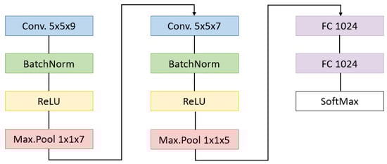 Figure 5. CNN implemented with the filter sizes.The training is performed by gathering the input patches in mini-batches of size 1024, passing two times through the whole set of mini-batches. The AdamW [51] optimizer has been used with a learning rate value of 0.00005 and weight decay of 0.01.