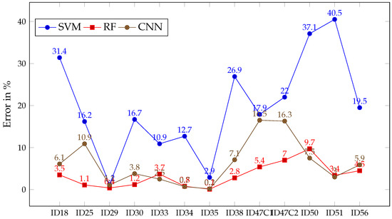 Error in % for SVM (blue), RF (red) and CNN (brown) after classifying each patient image in Experiment A.