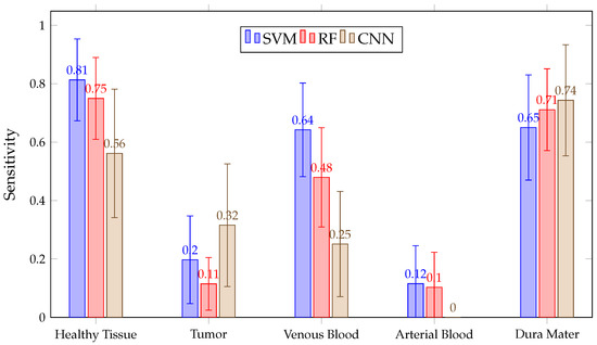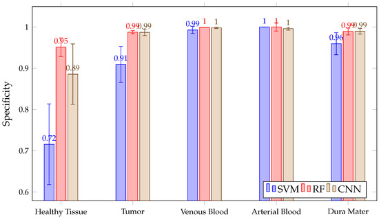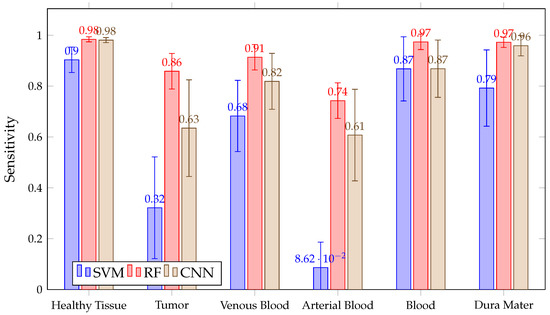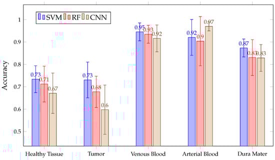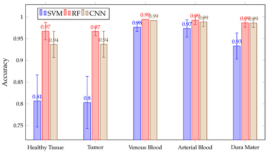 In addition, as shown in Figure 14, all three algorithms have high results, with a mean above 90% in the tumor, venous blood, arterial blood and dura mater classes. However, in the healthy class, SVM presents a lower than RF, with CNN and RF presenting high inter-patient variability in healthy tissue. Moreover, SVM presents lower than RF and CNN in the tumor class.
