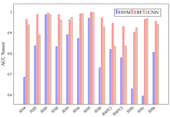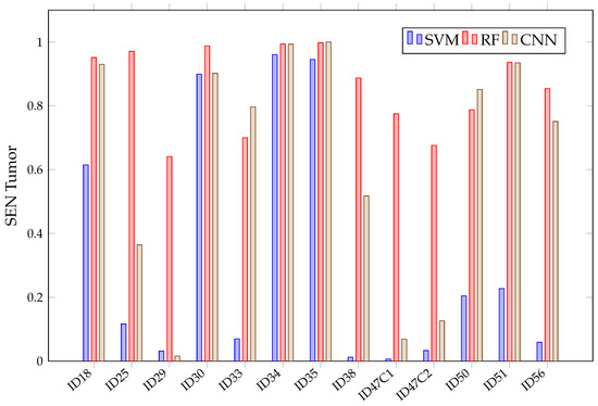 When looking at the mean in Figure 11, it can be observed that it is not possible to conclude, among the chosen algorithms, which presents the best sensitivity. This is because of their overlapping confidence intervals in all classes. However, SVM presents worse results in healthy tissue, tumor, arterial, venous blood and dura mater classes than RF. It also has worse than the other algorithms in the healthy and arterial blood classes. Furthermore, SVM again shows a rather unstable behavior; this can be seen in Figure 12, which shows the obtained per patient and algorithm in the tumor class. These results show how SVM obtains results above 80% in patients ID30, ID34 and ID35, but in others, such as ID29, ID33, ID38, ID47C1, ID47C2 and ID56, it shows values below 6%. In addition, CNN presents more variability per patient, especially in the tumor class, venous blood and arterial blood. In Figure 12, it can be observed that CNN obtains results above 80% in patients ID18, ID30, ID34, ID35, ID50 and ID51, but in others, such as ID29, ID47C1 and ID47C2, it does not exceed 13%. However, RF behaves more stably, obtaining sensitivity results above 64% in all patients.