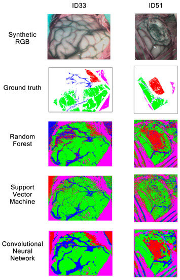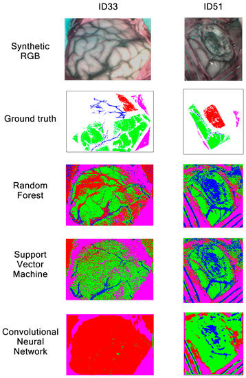 First, SVM [34] is a powerful and effective algorithm, being one of the most used predictors applied in classification problems, where the goal is to find the optimal hyperplane separation of the data trained for classifying different classes. Second, RF [35] is a flexible algorithm based on decision trees that operates as an ensemble to achieve a more accurate prediction. Third, CNN [36] is a class of deep learning neural networks (DLNNs) which convolves learned features of the images as input data and uses convolutional layers to classify the different classes effectively. In this way, the classification model is used to predict a finite number of brain tissues using data previously labeled by the neurosurgeon, defined as ground truth (GT) maps. The GT maps contain reference information of the original image taken during surgery to indicate the different types of tissue corresponding to each pixel associated with a spectral signature. This information is used by the ML algorithm and to create in-vivo brain visualizations as classification maps [37,38], providing an accurate tool for the neurosurgeon to excise the tumor. Algorithms used are briefly described in Section 2.5 while comparison results can be found in Section 3.