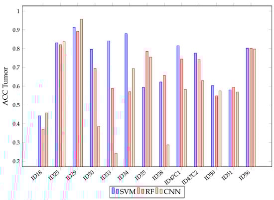 SVM, RF, CNN accuracy in tumor class for each patient in Experiment A.