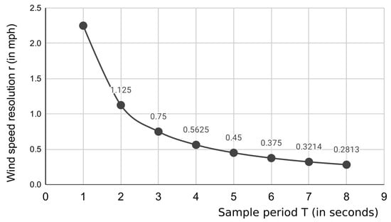 T proportionally affects the wind speed resolution. For instance, if the sample period selected for an application was 1 s, recalling that