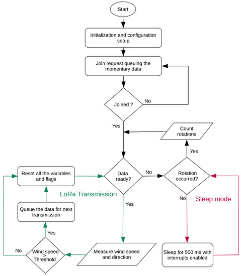 Based on these three functionalities, an algorithm was developed to acquire the data from the anemometer and send it to the LoRa server based on the transmission rate requirements. The algorithm flow chart is available in
