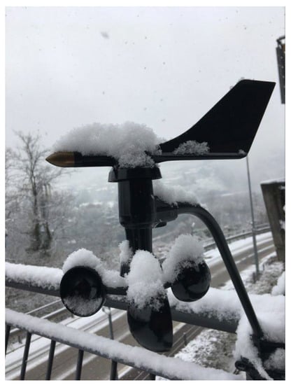 37]. This anemometer transduces the wind direction by means of a wind vane connected to a linearly variable electrical resistance within the range of 0–20 KΩ. The resistance value provided as an analog output will change according to the actual wind direction. For such A/D conversion, the 10-bit ADC internal to the MCU will be used. More in detail, the wind vane is calibrated from the factory to output a value of 10 KΩ to represent the South direction with an angle of 180° meaning that East, North, and West correspond to values-angles pairs of 15 KΩ-90°, 0 Ω-0° (thanks to a dead band around the North direction) and 5 KΩ-270°, respectively. Conversely, the wind speed is digitally transduced by the anemometer by means of three wind cups that are free to rotate in the presence of wind. More in detail, each full revolution of the wind cups close a mercury switch, hence producing a digital pulse as output. The number of pulses can be converted into actual wind speed using the conversion formula provided in the device datasheet: