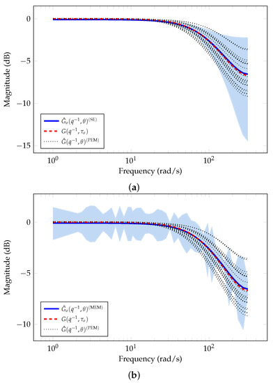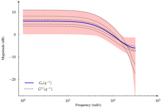 where denotes the backward shift operator (), r denotes a realization of the true system, is a fixed nominal model, and denotes the rth realization of a relative error-model for the true system. The red-shaded region represents the area in which possible true systems, , i.e, realizations of the true system (represented by black dotted lines), can lie. The error-model can introduce model parameter uncertainties at low frequency range and model structure uncertainties at high frequency range [10]. This system model behavior can be encountered, for instance, in an aeroservoelastic system model (see, e.g., References [5,25]). Aeroservoelastic systems include dynamic coupling due to structural, control, sensor and actuator dynamics that cover both the low frequency and high frequency range. This means that, in an ML framework, the estimates can change considerable from one experiment to another, even if the number of measurements used to obtain an ML estimation is large, due to the structural and parametric uncertainties in the true system model. Hence, it is desirable that the models obtained from system identification techniques provide a quantification of their uncertainty, i.e., considering that the uncertainty modeling is part of the structure and estimating a nominal model with an error-model [26,27,28]. This approach of uncertainty modeling can be used for robust control design in which optimization methods can be used to obtain controllers in order to minimize the expected variation (variance) of the true system performance from a given desired behavior [29], or to obtain a probabilistic solution for robust control design [30,31].