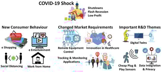 The changes in consumer behavior, government policies, and organisation priorities open a range of opportunities to adopt IoT for innovative solutions to prepare for the new normal. Many of the changes in this new normal such as remote work and telehealth and so forth are expected to stay even after we get over the pandemic. For example, Pew Research Center recently conducted a study [] where more than 900 innovators, developers, business and policy leaders, researchers and activists were asked to consider life in 2025 in the wake of COVID-19. Most of these experts believe that the future will be much more technology driven as a large population comes to rely more on “tele-everything” such as remote work, education, health care, daily commercial transactions and essential social interactions and so forth. Therefore, researchers and developers need to come up with new products and services that align with the changed consumer behaviors. The new product and service requirements will drive the organisations to reconsider their Research and Development (R&D) budgets in order to align with new research themes. Figure 1 shows an example of how COVID-19 is affecting IoT research and development.