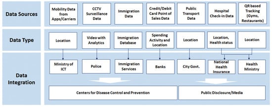 Data Integration. In this layer, the data from different sources are integrated and shared with the relevant departments []. For example, the immigration database and National Health Insurance (NHI) database are shared with the Centers for Disease Control and Prevention []. Location information is shared with local authorities. For example, surveillance data from smart city setup is shared with police officers for necessary actions []. Data extracted from certain sources such as public transport and shopping malls is also shared with public to help them make informed decisions about their daily routines [].