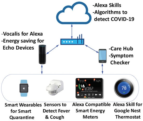 Many Smart Home devices have introduced various new features in response to COVID-19. For example, Amazon’s Alexa Care Hub can help people to remotely check in on their family members who they are not able to visit due to COVID-19 restrictions []. When family members agree to connect on Care Hub, their activity profiles on Echo devices are shared with each other and alerts/notifications can be generated for certain situations. Infermedica, a health tech startup, has developed a mobile application called Symptom Checker which interviews home occupants and guides them about their current health. They have also developed an Alexa skill to integrate Symptom Checker with smart homes []. Technologies and tools are also being developed to diagnose COVID-19 using speech analysis. Vocalis, a technology company providing voice-based healthcare solutions, is developing a mobile application (Alexa skill will be developed later) which will be able to detect symptoms of COVID-19 using voice signals []. They had previously developed solutions to detect flare-ups of chronic obstructive pulmonary disease by identifying the signs that users were short of breath when speaking. WiFi signals have also been used as a non-intrusive approach to measure respiratory rate of COVID-19 patients []. Alexa is now also connected with wearables []. These new features are helping researchers to propose smart quarantine solutions  []. Nguyen et al. [] provide a comprehensive overview of how different technologies and sensors (e.g., machine learning, computer vision, thermal sensors, inertial sensors etc.) can be used to encourage or enforce social distancing. They suggest that smart infrastructures should incorporate a pandemic mode in their design to better respond to future pandemics. IoT systems to detect fever, cough, sneezing, and so forth are also being proposed to better analyze the health profile of home occupants []. These and other similar advancements enable web dashboards and mobile applications to better monitor and analyse the health profiles of smart home residents.