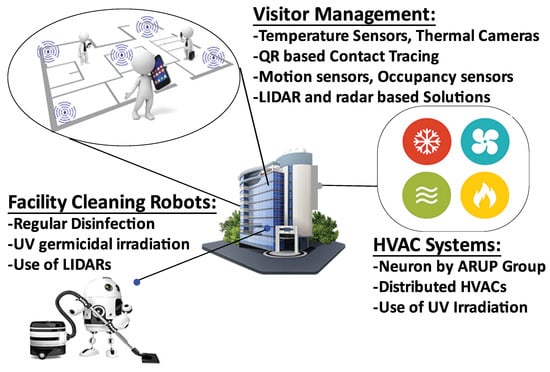 COVID-19 demands improved facility management and cleaning capabilities to avoid the virus spread. New SOPs are being adopted for cleaning and disinfection []. Smart buildings should include efficient and effective disinfection of indoor spaces especially frequently used surfaces such as door handles, and elevator buttons and switches. To this end, companies are deploying robots to disinfect venues frequently and efficiently []. Researchers at the Computer Science and Artificial Intelligence Laboratory (CSAIL) at MIT have developed a robot to ensure spaces are kept as clean as possible []. The robot works on the principle of ultraviolet germicidal irradiation and utilizes short wavelength ultraviolet light to kill microorganisms. Similarly, UVD Robots, a subsidiary of Blue Ocean Robotics, have developed a robot equipped with mobile base and LIDAR [] that creates a navigation map of patient rooms to be disinfected. Furthermore, the data from various sensors deployed in a smart building can be used to identify the spots that need to be disinfected, for example, areas visited by many people or surfaces touched by someone who is detected to have elevated temperature or other symptoms. Robots developed by Boston Dynamics [] are being used in Brigham and Women’s Hospital of Harvard University. Researchers in [] have developed an i-Robot equipped with eight UVC lamps for disinfection purposes. A recent study [] elaborates on disinfection robots being used in different types of buildings.
