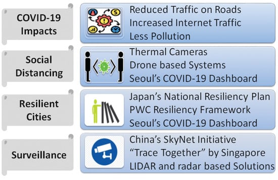 COVID-19 is not the only catastrophe which we have ever faced or will face. There are always possibilities of future pandemics, recurring natural disasters (e.g., earthquakes, floods and droughts) and disruptions caused by humans (e.g., strikes, cyber attacks and terrorism). It should not be very surprising that urban areas are typically more vulnerable to disasters, for example, around 95% of the COVID-19 cases have been reported in urban areas. COVID-19 has proven to be a catalyst to ensure resilience in smart cities and there has been an increased interest in developing smart cities that are economically and environmentally resilient against natural disasters and human created troubles. PwC Middle East has derived a smart city resiliency cyclic framework consisting of Sense (predict threats using data analytics and other tools), Defend (reinforce weak links within city organisations), Respond (set up crisis management and empowered task forces), and Recover (identify key assets that need to continue operating at a reduced capacity) []. PwC Middle East selected five cities—Boston, Helsinki, Riyadh, Singapore and Vienna—that adopted smart technologies and demonstrate how the proposed framework can be applied in this pandemic and to build long-term resilience against future threats. Japan has also set an example in implementing smart cities resiliency. Its National Resiliency plan covers smart communications, sustainable energy systems and resilient water networks. Initiatives taken in Japan for National Resiliency has been enlisted in [].