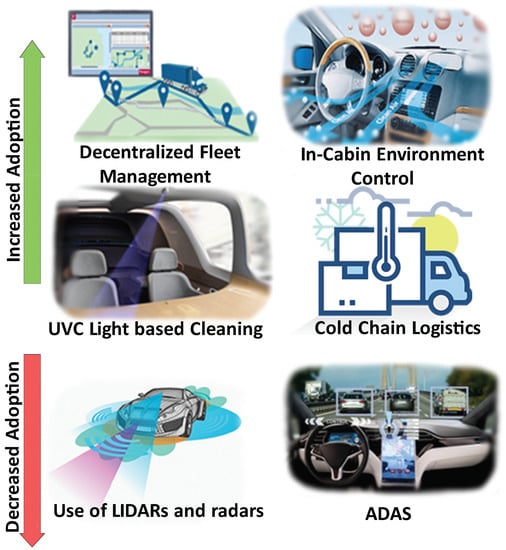 Automotive industry was already in recession even before COVID-19. The pandemic has created another dip to this recession which is expected to delay the recovery until 2025 []. The current recession has resulted in a delay of Autonomous Driving (AD) and Advanced Driver Assistance Systems (ADAS) adoption in cars []. Research and development projects are being scaled down and corresponding timelines have been adjusted. Most LIDAR and radar startups in ADAS space are pivoting to non-automotive use cases such as industrial automation and mobile devices. Specifically, introduction of LIDARs in iPhones by Apple has re-ignited the interest of LIDAR players in smartphone and consumer space where they expect higher volumes in shorter time because of shorter design cycles in consumer segments []. Although the transportation sector has been hit pretty hard by the pandemic, there are still some areas within the sector that are attracting increasing attention such as in-cabin analytics and smart logistics. Figure 6 shows the summary of these. Below, we give the details.