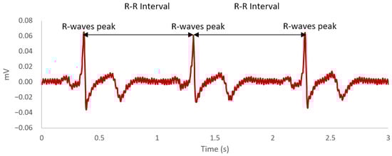 An example of a heartbeat waveform across a 3-second time window. The R-wave peaks are the most positive deflection observed in the waveform. The R-R intervals are the time difference between each R-wave peaks.