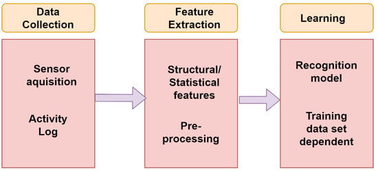 Figure 1. Learning phase of HAR.- Data Collection: This step acquires systems data from all the sensors available. Sensor selection is based on the type of device for which the recognition system is made for. The following steps contains a log of activities of every activity performed with the type of activity, time, and the respective duration. This step works independently without any signal interference as all these will take place in the next following steps.