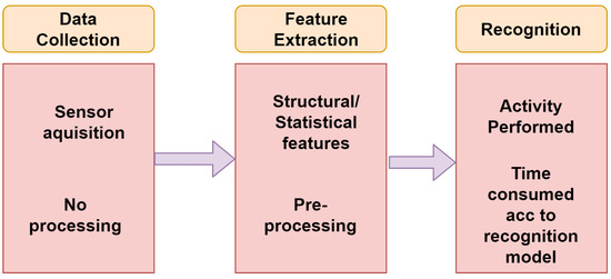 Figure 2. Recognition phase of HAR.- Data Collection: This particular step obtains the data from all those sensors which are available for the process of recognition. Based on a device for which the recognition is made for, the process of sensor selection can be done. In the learning phase, prior knowledge of the activities is a must, but, in the recognition phase, there is not any prior knowledge of the activities performed, which is why no activity log is required. As discussed above, data collection can be done without any signal processing, and that rest all can be done in the next feature extraction step.