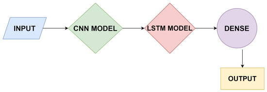 For feature extraction on the input layer, the use of convolutional neural network is good option to work upon with the combination of LSTMs so that the prediction of sequence can be done. The working of CNN-LSTM is shown in Figure 6. The input in the form of human activities would be taken, and the next step is to apply the CNN model, then the LSTM model, and then at last the dense layer to check whether both the models are working properly or not. After that, the desired output will be generated. The combination of both the classifiers was built for the prediction of time sequence problems, and textual descriptions can be generated from the concatenation of images, for example, videos. Specifically, the problems of Activity Recognition produce a textual explanation of an activity displaying in a chain of images. Image Description produces a textual explanation of a single image. Video Description produces a textual explanation of a chain of images.