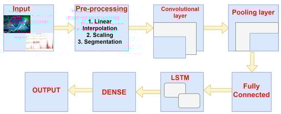 The architecture followed here is known as a Long-term Recurrent Convolutional Network or LRCN model, additionally referred to as “CNN LSTM”, which means LSTMs that use a CNN as a front end in the following process. The combination of CNN-LSTM gives an efficient and lightweight deep learning model, as shown in Figure 7. The input part will track the human activities in sequence, after which the pre-processing of the sequence data using linear interpolation, scaling, and segmentation, and then using CNN approach, and a convolutional layer will pass the data to pooling layer and then to the fully connected layer then the LSTM will pass the processed data by deciding whether to keep or forget the information. Then, the dense layer will tell whether the proposed architecture is working in an appropriate manner, for example, to check whether the CNN model is extracting the valuable features and LSTM model for the interpretation of features in sequential manner. Then, finally, the recognition of the human activities takes place. This model is used for producing textual explanation of images, as well. The main key point to use the CNN that on any image classification task the pre-training is quite challenging but can be reallocated as a feature extractor also for the production of various caption problems. The various applications of the following model is to solve the natural language processing(NLP) and also speech recognition related problems where the CNN classifier is used for extracting the features and LSTMs are being used for thr input data. The CNN-LSTM has various problems which are being discussed below: