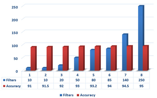 The following model can be achieved by performing on Raspberry Pi3 with 4x ARM Cortex A-53, 1.2 GHz processor, and 4 GB RAM. The model for human activity recognition is implemented in Python 3.8.8 and Tensorflow 1.7. Some of the basic steps took part in experimentation are discussed one-by-one below. Figure 8 shows the results of accuracy with that of the filters. A function known as evaluate model, which picks both training and testing datasets and is able to fit a model based on training, then evaluates on the test data and, finally, gives output with the models performance estimation.