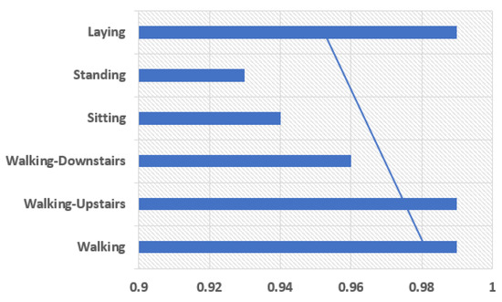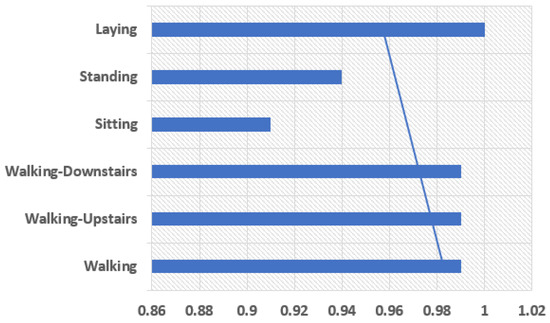 The model is comprised of the two one-dimensional CNN layers with a dropout layer for the regularization process followed by a pooling layer. The CNN layers in a group of two can be defined so that the model can learn the features fast from the input data. Though it is known that CNN learns very fast the work of dropout layer is to make the learning process slow so that the model can be able to work accurately. The work of pooling layer is the reduction of learning features to 1/4 their size by considering only the most important elements. Then comes the learned features that are being flattened to one of those long vectors and before output layer predicts any result the features can firstly be passed through a fully connected layer. The use of fully connected layer is that it will be able to provide a buffer for the prediction process, a storage between learned features and output. A standard configuration of 64 parallel feature maps and a kernel size of 3 is the major requirement of this model. The number of times the processing of input takes place is the feature mapping, and the number of input steps should be considered as sequence required for input in kernel size used to read or processed the learning features. For the network optimization, an efficient method known as gradient descent is used. The requirements for a model to be fit for a fixed number of epochs 10, batch size of 32 samples, exposure of 32 windows of data but before the models weight updation. The graph between human physical activities with precision values and the f1 score the results can be shown in Figure 10 and Figure 11.