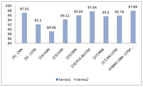In addition, the various deep learning classifiers with their following accuracies are covered in the graph, as shown in Figure 12, which shows that our proposed model is 97.89% accurate.