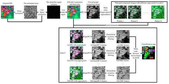 The HSIs are inevitably contaminated with various noises due to equipment limitation and atmospheric environment impact. On the other hand, the computational complexity will grow exponentially as the dimension increases, which will cause the “curse of dimensionality”; two problems that limit the subsequent classification. We proposed a novel transformation domain-space domain feature extraction framework, called LRS-HRFMSuperPCA, which can effectively improve the classification accuracy and is effective for HSI denoising.