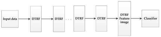 Inspired by the idea of deep learning [42,43], we set up a hierarchical structure based on DTRF [13], as shown in Figure 2, the output feature set of the upper level DTRF unit is used as the input of the next level DTRF unit. The spatial information and spectral information of hyperspectral data are fully mined. The obtained spatial-spectral features preserve the global similarity structure, local geometry structure and rich spatial information of the hyperspectral dataset.
