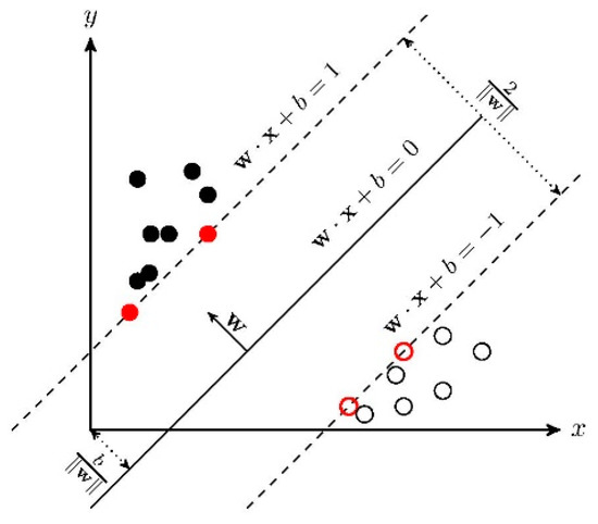 In the case of linear inseparability, the linear inseparable samples in the low-dimensional input space are transformed into a high-dimensional feature space by using a nonlinear transformation algorithm. The nonlinear transformation is to map the sample information in the input space into a high-dimensional space through a properly defined inner product function, and then find the optimal linear classification surface in the new space. The optimal classification surface is obtained when the maximum interval classification line is expanded to the -dimensional space. The optimal classification line cannot only correctly separate some individuals of different categories, but also maximize the overall classification interval. The general principle of SVM is shown in Figure 3.