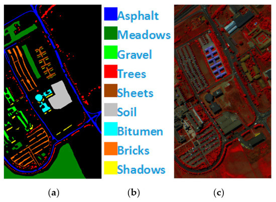 PaviaU is a pixel HSI collected by the ROSIS hyperspectral spectrometer sensor over Pavia University. A total of 115 bands of 9 types of ground objects are included, and 12 bands with noise are eliminated. The remaining 103 bands are utilized as the experimental dataset, and the total number of labeled pixels is 42,776, Figure 5 shows PaviaU’s ground value map, specific species and false color map.