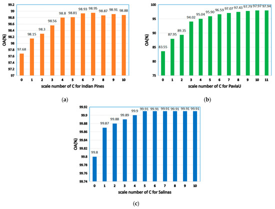 In order to fully compare with the training set in the references corresponding to the comparison algorithm, the contrast experiments are carried out on the training set which accounts for = 77 (10% Training set) and = 173 (20% Training set) for per class on Indian Pines and = 475 (10% Training set) and = 1139 (20% Training set) for PaviaU, = 102 (3% Training set) and = 170 (5% Training set) on Salinas, leaving the rest samples to form the testing samples. For 10% training data on Indian Pines and PaviaU, 3% training data on Salinas, from Table 5, our method obtains 99.32%, 99.87% and 99.73% OA values on the three datasets. For 20% training data on Indian Pines and PaviaU, 5% training data on Salinas, from Table 6, our method obtains 99.63%, 99.91% and 99.90% OA values on the three datasets.