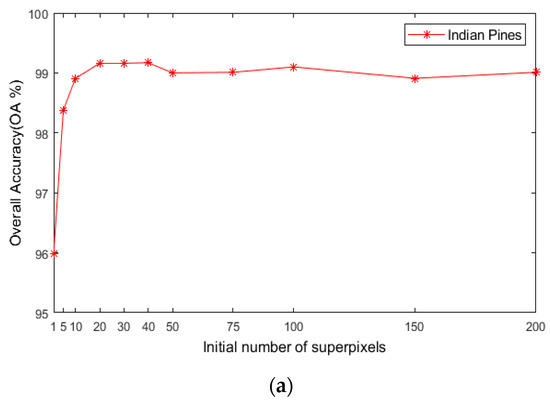 The computational time of the LRS-HRFMSuperPCA algorithm and other comparison algorithms are represented in Table 9. The running environment of the LRS-HRFMSuperPCA and all the comparison algorithms is a notebook computer with 12 GB memory and a 2.2 GHz CPU processor. Except for GhoMR and SSRN, the running environment of GhoMR and SSRN are pytorch 1.6.0 and CUDA10.1 in the open-source GPU environment of Google lab, the running environment of other algorithms is MATLAB2018a. Table 8 shows the number of training samples as a percentage of the total sample number in the measurement run time to experiment on the three datasets. According to the analysis of Table 9, the LRS-HRFMSuperPCA algorithm takes a long time on the Indian Pines. The main reason is that this technique utilizes multi-level domain transform recursive filtering and multi-scale superpixel segmentation. As seen in Figure 18a,b, under different training sets of Indian Pines, the OA of our method is enhanced compared to other comparison algorithms. On the PaviaU and Salinas, the CCJSR took the most time since the computation of the correlation coefficient of the training set increased by increasing the training set, followed by the KNNRS. The main computation of the KNNRS is caused by the operation of KNNs. The operation time of the MSuperPCA is mainly caused by multiscale hyperpixel segmentation of HSIs. The run time of our method on the PaviaU is lower compared to the KNNRS, MSuperPCA, and CCJSR. The OA index of this method is also improved compared to other algorithms on PaviaU, for the GhoMR. Although the time cost of our algorithm on Indian Pines and PaviaU is higher than that of the GhoMR, the classification accuracy of our algorithm is better than that of the GhoMR in various training sets. Moreover, the time cost on Salinas is lower than that of GhoMR. Thus, the experimental results show that the run time of LRS-HRFMSuperPCA is acceptable.
