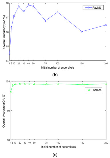 OA of the proposed LRS-HRFMSuperPCA method with different numbers of training samples on different images. (a,b) Indian Pines; (c,d) PaviaU; (e,f) Salinas.
