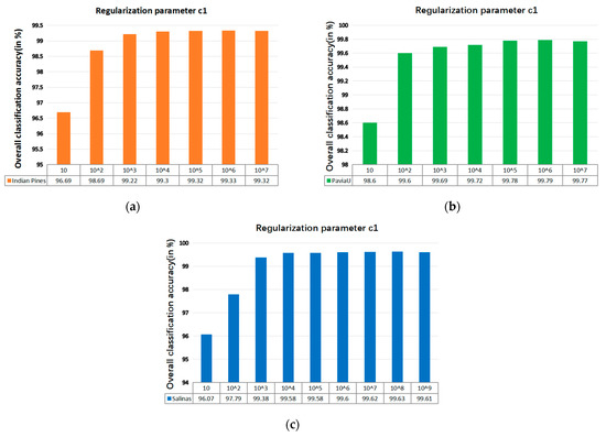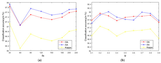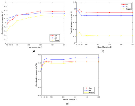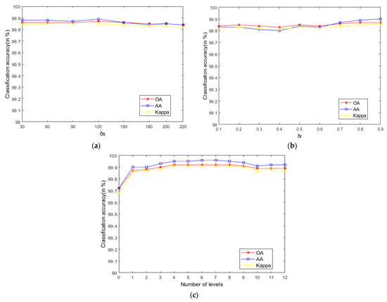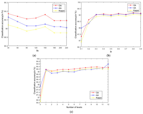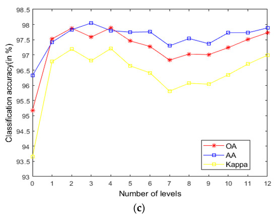 - According to the data in Table 7 and Table 8, LRS-HRFMSuperPCA is superior to the feature extraction algorithm using a single filter. Compared with IFRF and KNNRS, our method uses low-rank sparse representation algorithm to denoise the original HSI. It can be seen from Table 3 that the OA of LRS-HRFMSuperPCA is 0.23% higher than that of HRFMSuperPCA, and PSNR has also improved. This supports the correctness of LRS [17] that can remove mixed noise in the original HSI. Compared with LRS-MSuperPCA, the small-scale textures of the HSI can be eliminated by the multi-level spatial domain recursive filtering algorithm, fully obtaining the spatial-spectral joint information of the HSI and improving the OA. It can be seen from Figure 9c, Figure 10c and Figure 11c that the OA of LRS-HRFMSuperPCA is always higher than that of LRS-MSuperPCA on the three datasets. The comparative experiments verify that the DTRF [13] and IFRF [26] can remove texture structure and improve classification accuracy. These results support earlier studies.