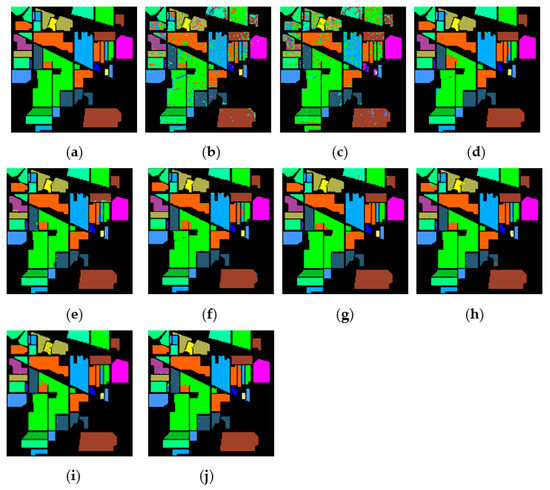 The classification maps obtained by different methods on the Salinas dataset when training samples account for 3% of the reference. (a) GroundT. (b) SVM (OA = 93.05%). (c) PCA (OA = 92.94%). (d) IFRF (OA = 99.42%). (e) CCJSR (OA = 95.37%). (f) MSuperPCA (OA = 99.53%). (g) SSRN (OA = 99.34%). (h) KNNRS (OA = 99.68%). (i) GhoMR (OA = 99.30%). (j) LRS-HRFMSuperPCA (OA = 99.78%).