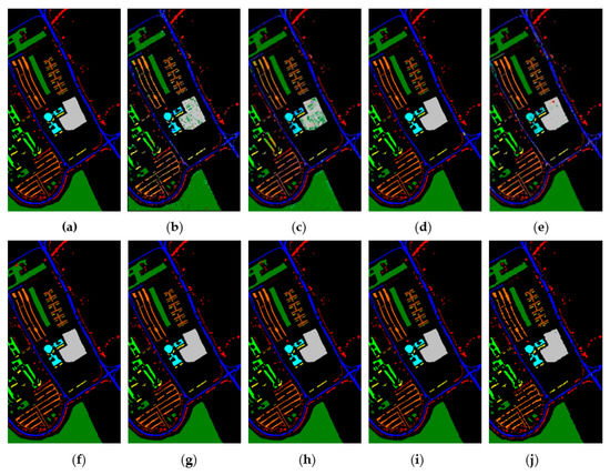 The classification maps obtained by different methods on the PaviaU when training samples account for 10% of the reference. (a) GroundT. (b) SVM (OA = 94.17%). (c) PCA (OA = 90.50%). (d) IFRF (OA = 99.21%). (e) CCJSR (OA = 93.73%). (f) MSuperPCA (OA = 99.40%). (g) SSRN (OA = 99.47%). (h) KNNRS (OA = 99.45%). (i) GhoMR (OA = 99.54%). (j) LRS-HRFMSuperPCA (OA = 99.88%).