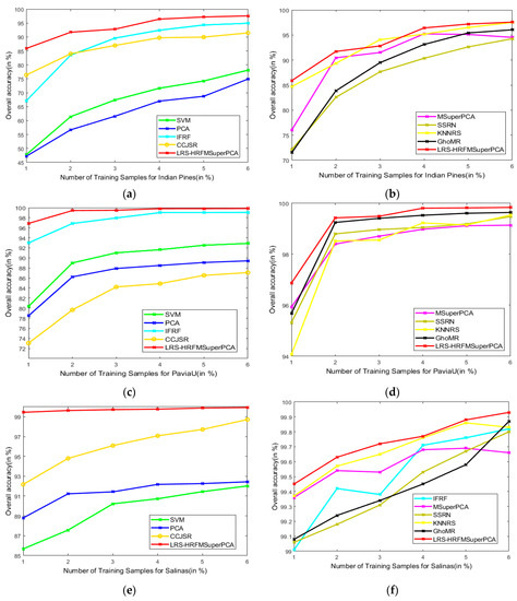 This section analyzes the effects of various training and test sets on the OA of our method and the other methods. Figure 18 represents the classification results of the LRS-HRFMSuperPCA method. The number of training samples of three datasets increased from 1% to 6%. According to Figure 18, with different training sample numbers, the OA can be improved significantly by our method by increasing the number of training samples. Hence, we can conclude that our method can achieve the best OA for the three datasets compared to other state-of-the-art comparison algorithms.