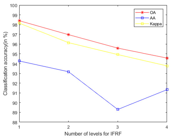 - In general, we notice that the mixed noise in HSI will reduce the classification accuracy [9]. Considering the effects of imaging sensors breakdown, environmental pollution, and other factors, these degradation factors account for a small proportion in HSI. We usually build them as sparse noise models here. A clear natural image (specific to our article, it is a HSI) is often a low-rank structure; therefore, when dealing with the mixed noise problem of natural image, we usually use the low-rank sparse representation algorithm to solve it. In order to remove the small-scale textures in HSI, domain transform recursive filtering is used to solve this problem. Another knowledge base is that after the stable low-rank feature natural image (specific to our article, it is a HSI) is extracted (specific to our article, it is LRS-MSuperPCA in Section 3.1), the joint information of the spatial-spectrum of the feature image can be obtained by hierarchical filtering (specific to our article, it is HDTRF in Section 3.2). In order to facilitate understanding, we apply hierarchical recursive filtering to IFRF (Figure 19) for experimental verification.
