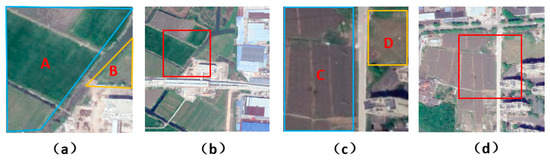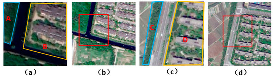 Demonstration of samples. (a,c) are samples with “scene distortion”. (b,d) show corresponding surrounding environment of (a,c). In (a), the forest object A is clipped improperly, and there is a large area of urban scene in B. Similarly, in (c), the urban scene D is near forest C.