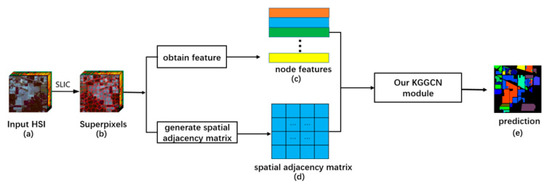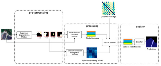 Our network is composed of five modules, including the superpixel segmentation module, node feature extraction module, spatial correlation recognition module, KGGCN module, and classifier module, to carry out semantic segmentation on remote sensing images, as shown in Figure 4. The input is the original image, and the output is the prediction.