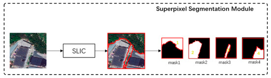 The superpixel segmentation module aims to divide images into superpixel blocks and extract masks of them. The structure of this module is demonstrated in Figure 5.